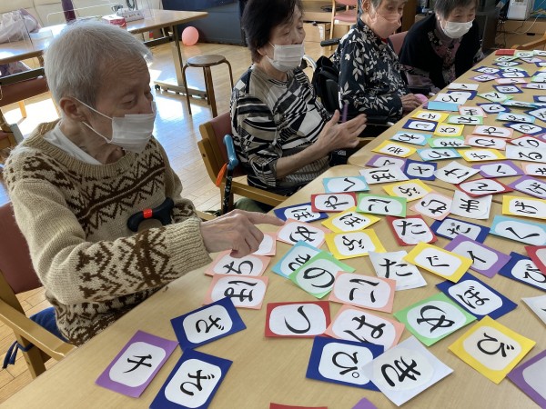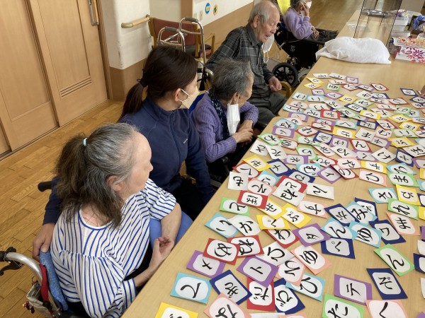 今日は「かるた大会」です。職員作成のオリジナルかるたで皆さんと楽しみました。