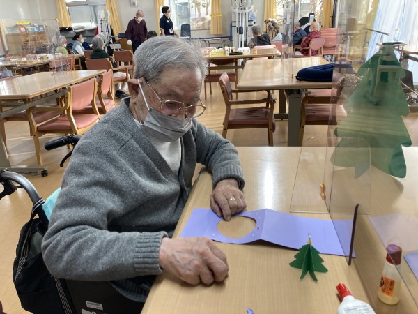 今回の工作レクリエーションはクリスマスが来月に控えているので、可愛らしい置き飾りを作りました。