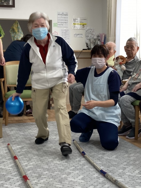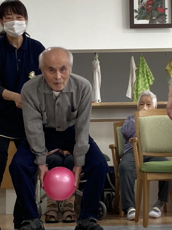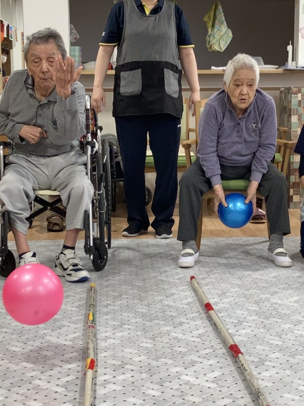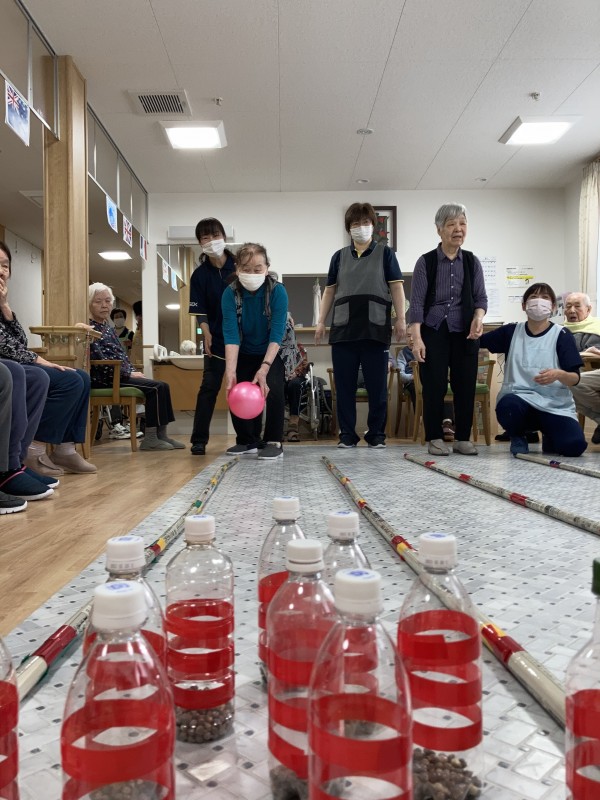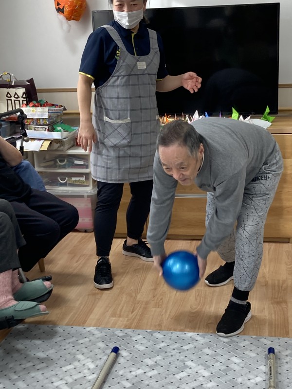 ボウリング大会を行いました(^^)!ピンは手作りです♪ペットボトルに数珠玉を入れました。レーンは新聞棒です(^o^) さぁ!ストライク決めましょう‼️「よーし!!」と真剣な表情です!皆さん張り切ってましたね〜(^。^)♪投げるフォームも決まってます❤️職員も負けてられませんね^o^!笑顔いっぱいで盛り上がりました〜*\(^o^)/* 一体感がありとても楽しいひとときでした(o^^o)❤️