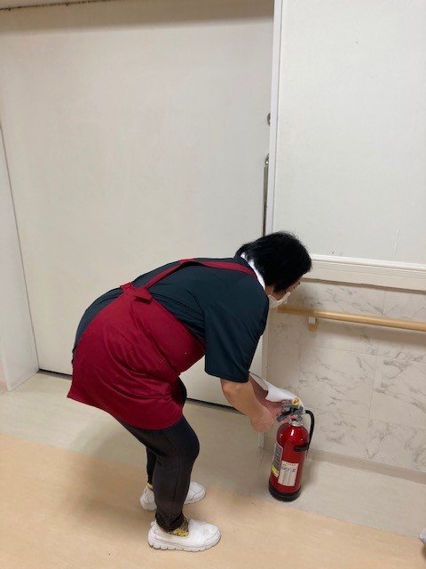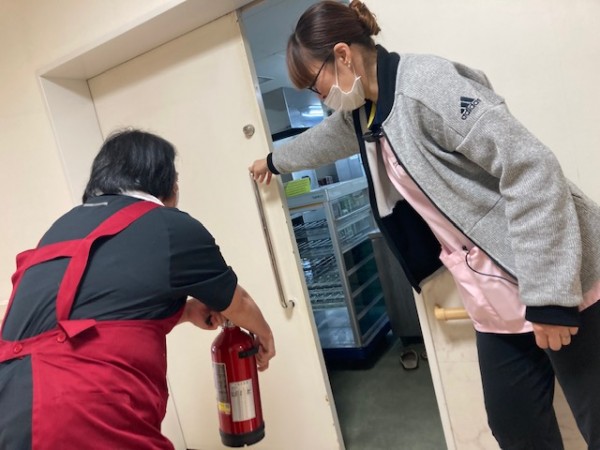 14:05~ 想定時間23:05~ 消火器『消火器保管場所の認知あるか』持ち出し厨房に戻り初期消火実施『消火器使用の手順できるか』