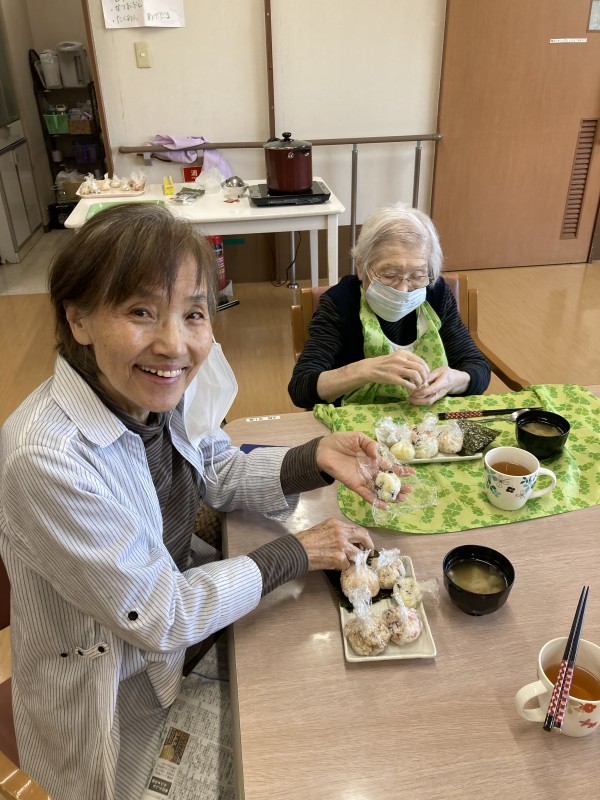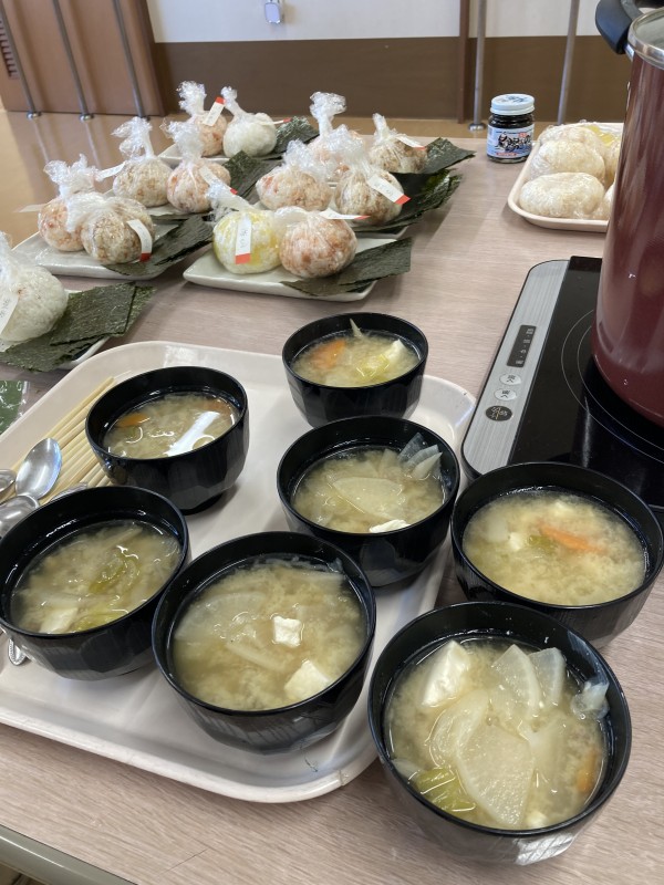豚汁をコトコト作り、好きな具材をいれて握っていただきました。