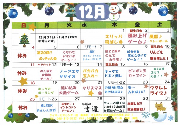 恒例のゲームや????クリスマス会☆彡など、楽しんでいただけるレクリエーションを開催いたします!