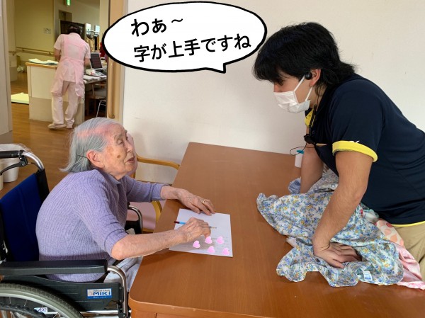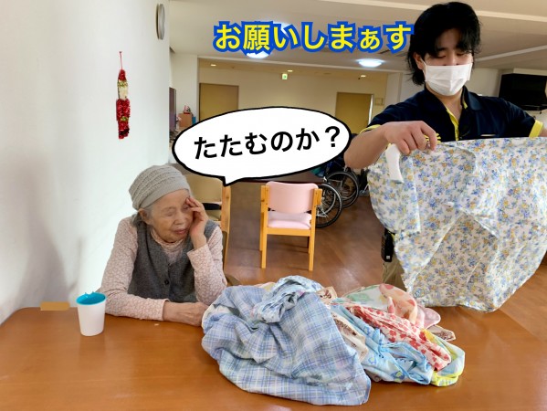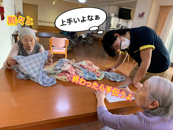 黙々とたたむ入居者様を見て、声をかけるお喋り番長様。