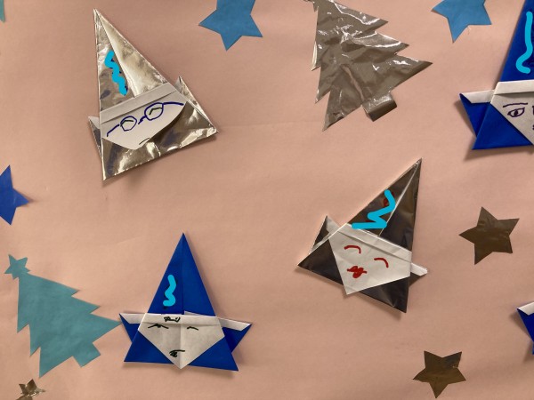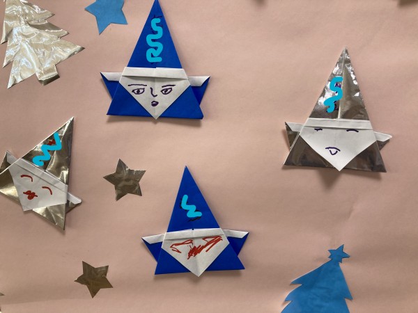 その後、折り紙で作ったサンタにお顔を描き、帽子のあたりに名前を書いていただきました。