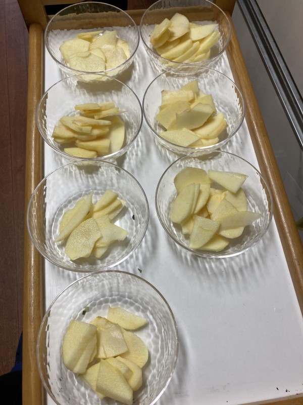 このリンゴを皆様が食べやすいように切って盛り付けて出来上がりです‼