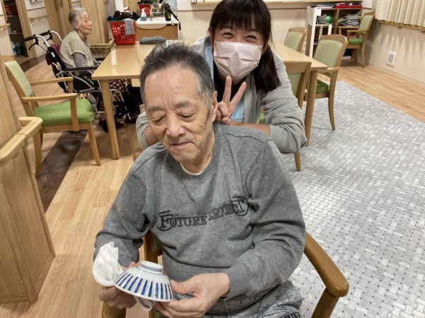 スタッフの見守る中❓テレながら夕食後の食器拭きをしてくださるご利用者様。楽しそうな雰囲気が伝わって来ますね。今日も一日お疲れ様でした♪