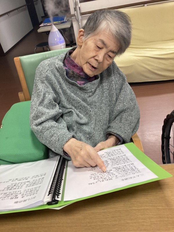 今日は、ご利用者様と歌詞を見ながら歌を歌いました。