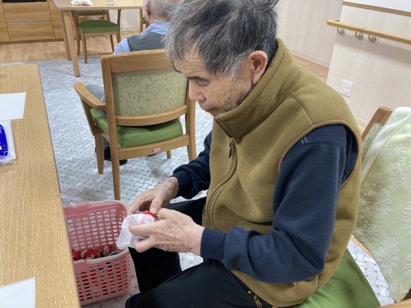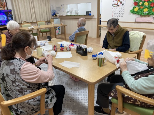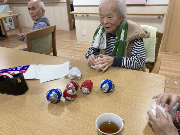 準備は着々と進んでいます!今日は、クリスマス会でみんなで楽しく参加出来る、座ったままで、棒を使って雪合戦をする為の、雪玉作りをしました。