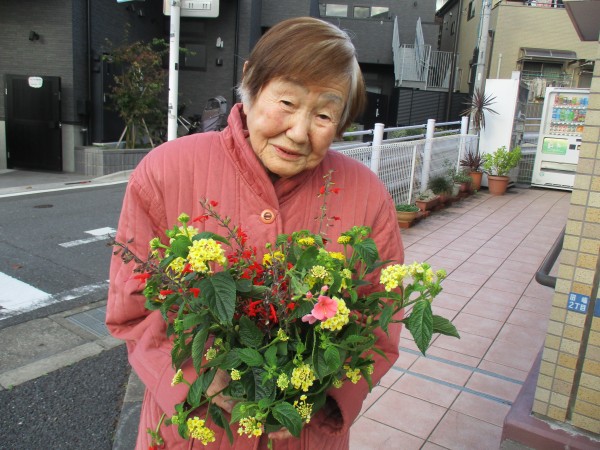 きれいになった歩道を少し歩かれ近所のお地蔵様まで・・・その後は花壇のお花を摘んで、ハイチーズ ♥♥♥ 「お掃除の後は気持ちいい!!」と、爽快なS様でした。
