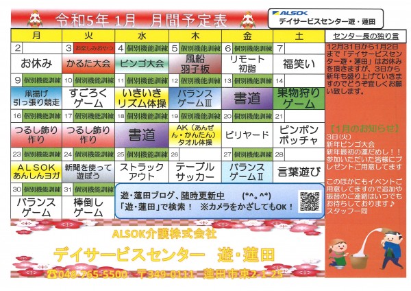 本日の遊蓮田は、来月の予定表が完成しましたのでこちらのご紹介になります。