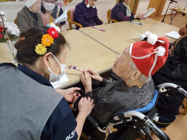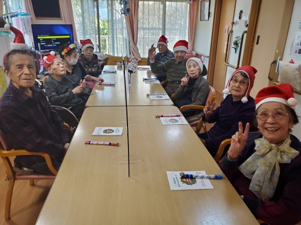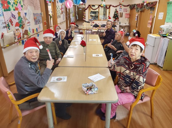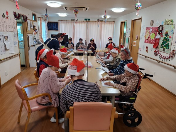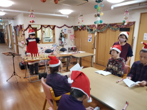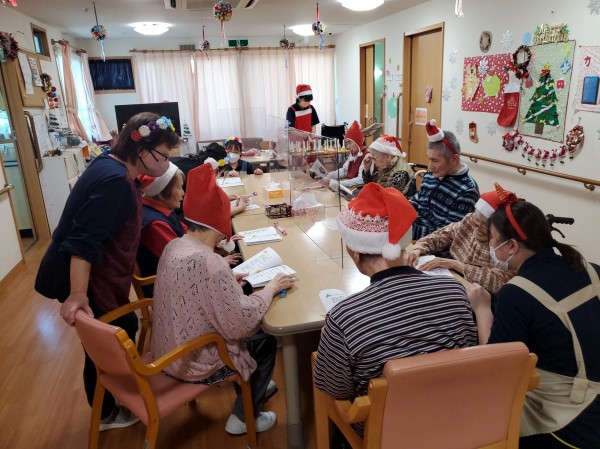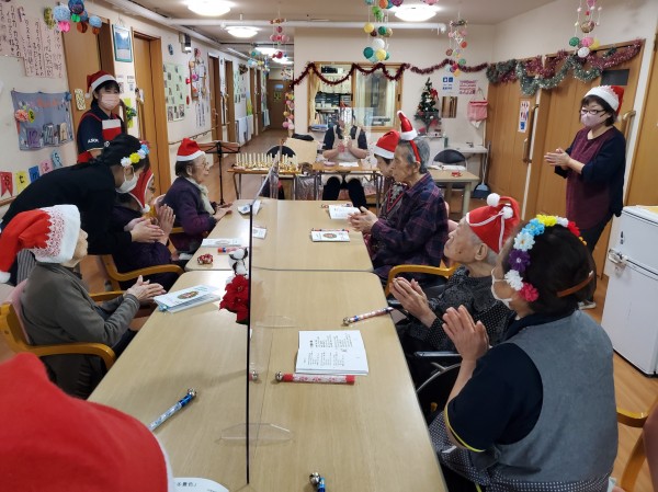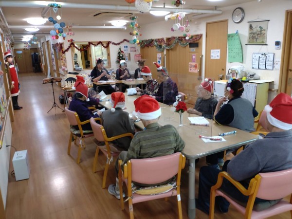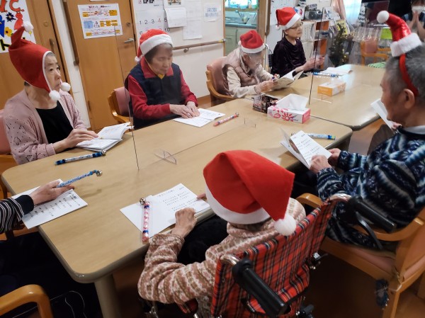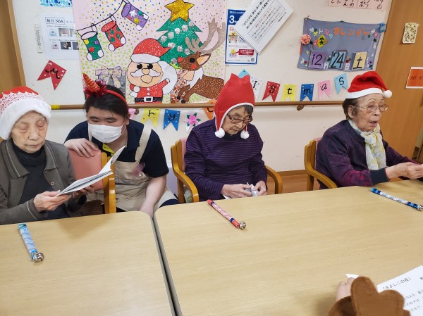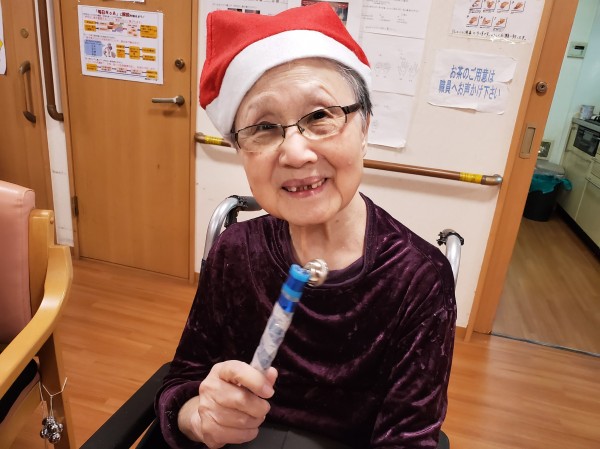 利用者の皆様も各々サンタさんの帽子をかぶられたり、ケアスタッフ手作りの鈴を持ったりされ、準備はOK!