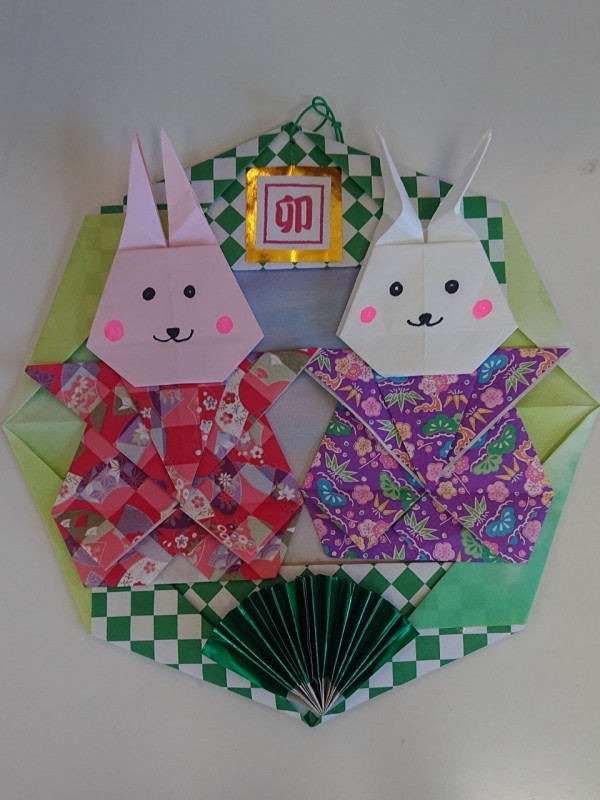 4つのパーツを組み合わせたリースに裃を着たうさぎを貼り、かわいらしい作品が完成しました。