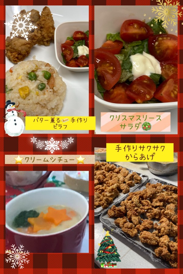 御食事のメニューは。。。唐揚げ ピラフ サラダ シチュー