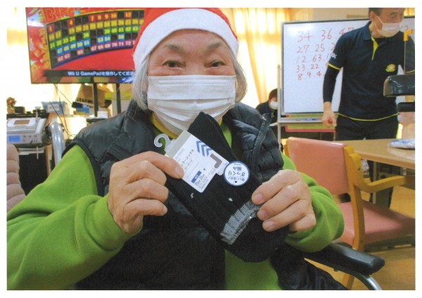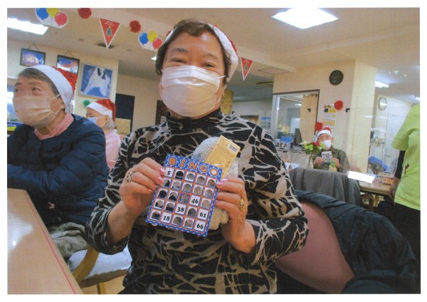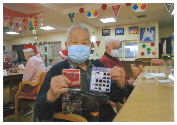 ビンゴで楽しんだ後はこれまた恒例のクリスマスケーキ。大きなケーキでまたまた盛り上がりました。職員も盛り上がりすぎたのでしょうか?肝心のケーキのお写真が・・・ございません????
