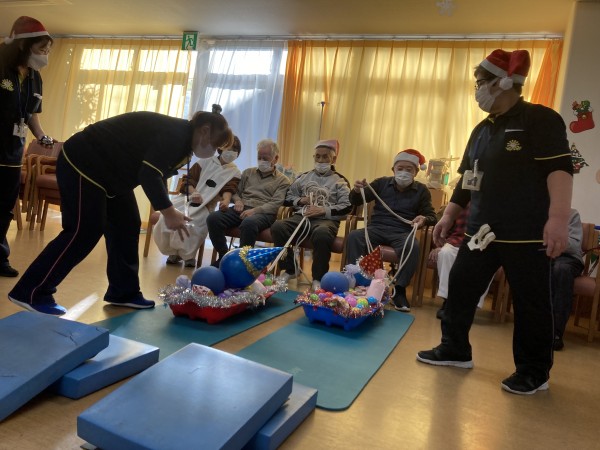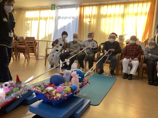 ソリにプレゼントの飾りやカラーボールなどを置き、ご利用者様にロープを引いてもらうゲーム!!ソリの中身が落ちたら、その場からやり直し!!