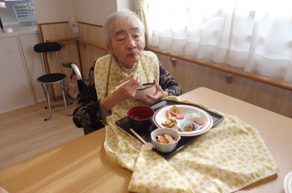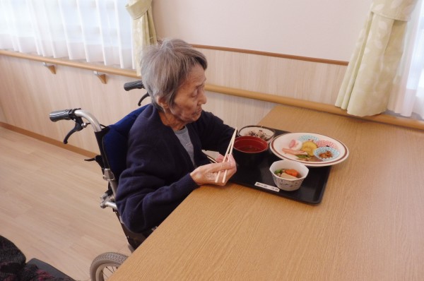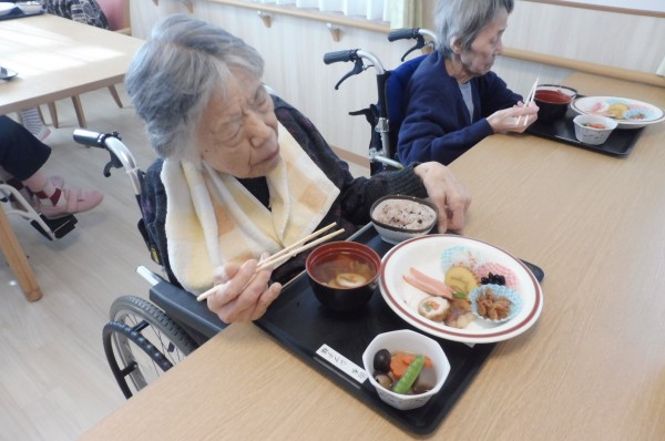 伊達巻、かまぼこ、チキンロール、黒豆などなど沢山ありました。職員の方も盛り付けにこだわって、きれいでした。