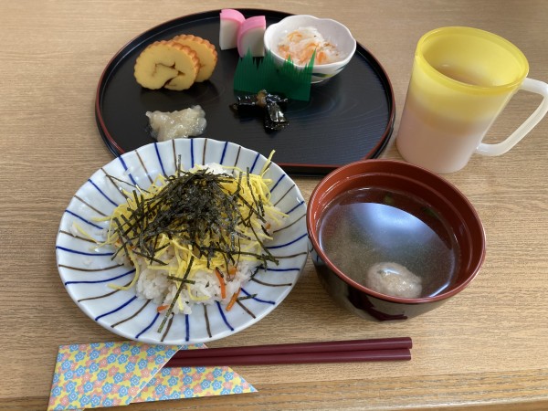 元日の昼食は、「ちらし寿司、3種盛り合わせ、紅白なます、豆きんとん、お吸い物」です。