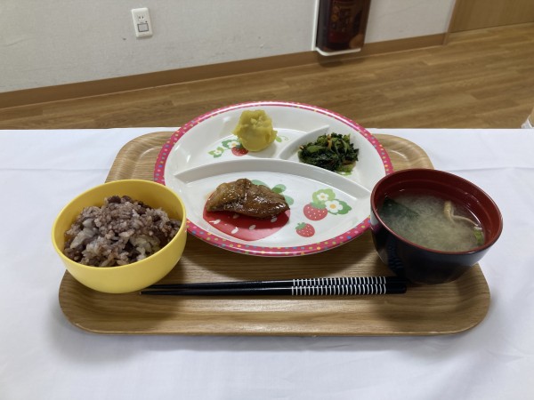 元日の昼食➡赤飯・赤魚・栗きんとん・菜の花のからし和え。