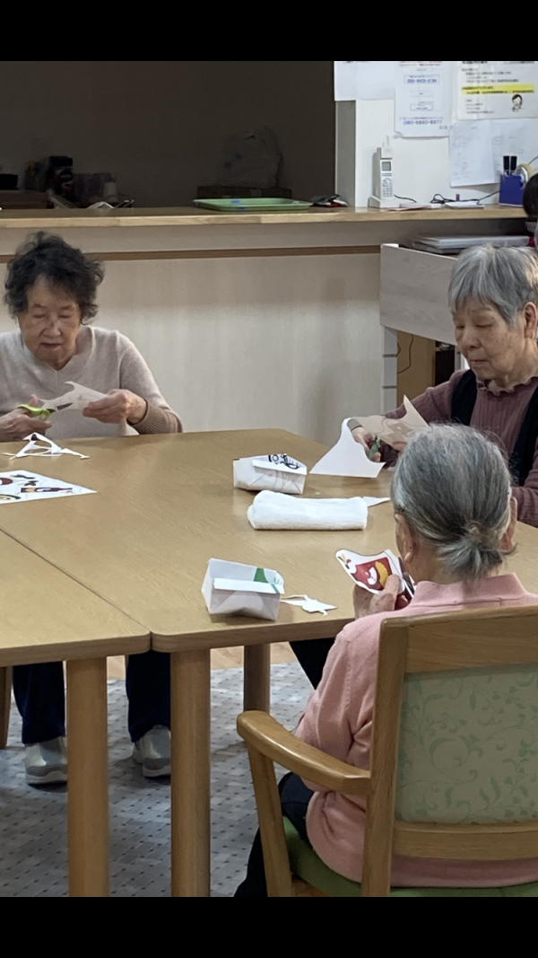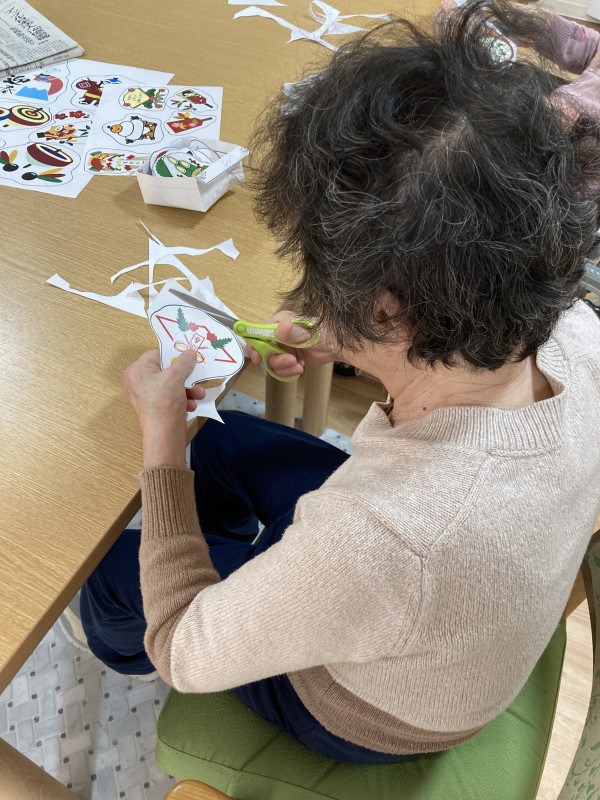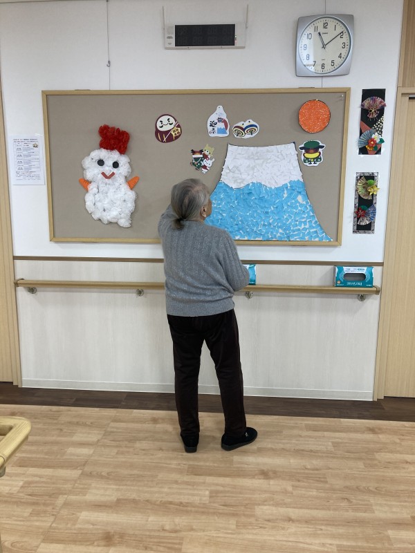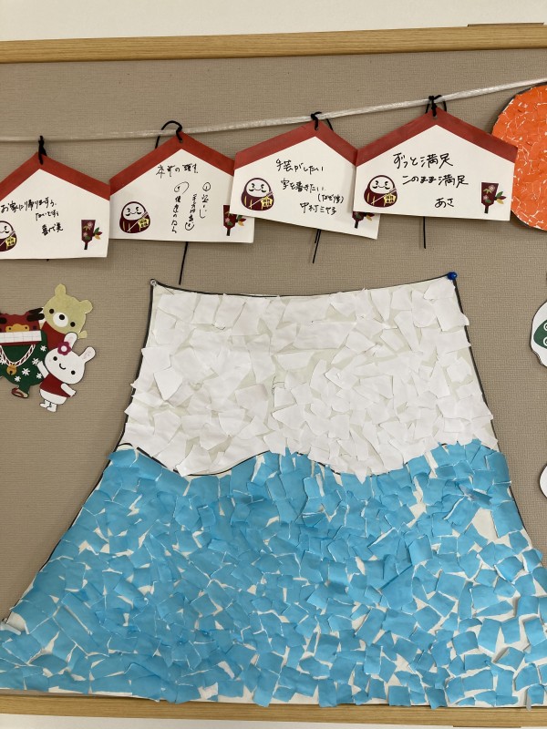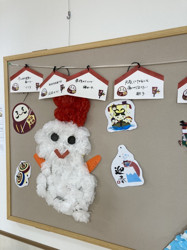 皆でお正月の壁飾りを作ります。ハサミでカットしたり、富士山の大きなちぎり絵もなんのその。手作り絵馬にそれぞれの思いを書いて頂き、立派な飾りが出来ました❣️