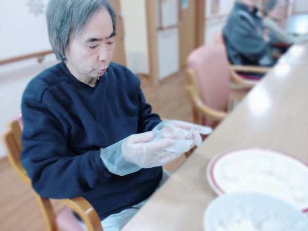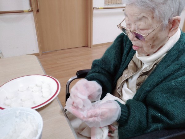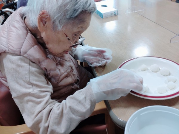 ご利用者様にお汁粉に入れるお餅の変わりに入れるお米のお団子を丸めて頂いたりして、お汁粉完成!