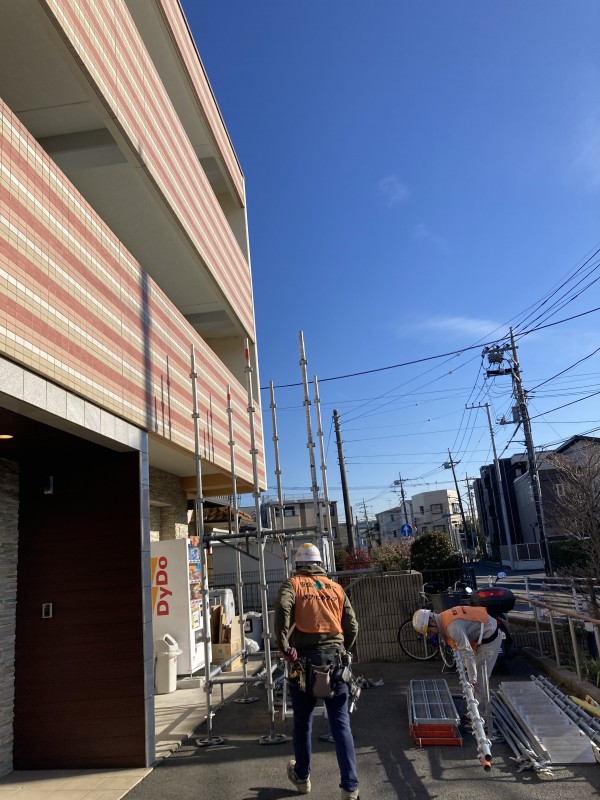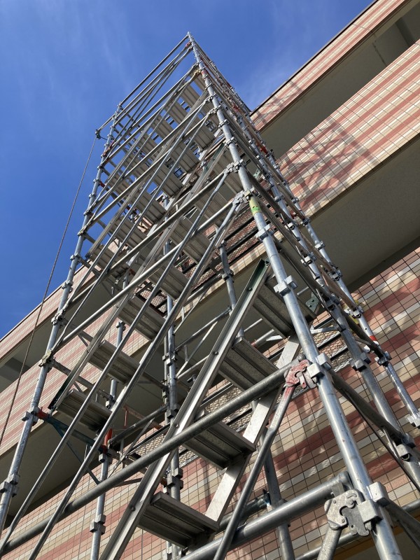 屋上に作業の方が上がるための足場作りがスタート!