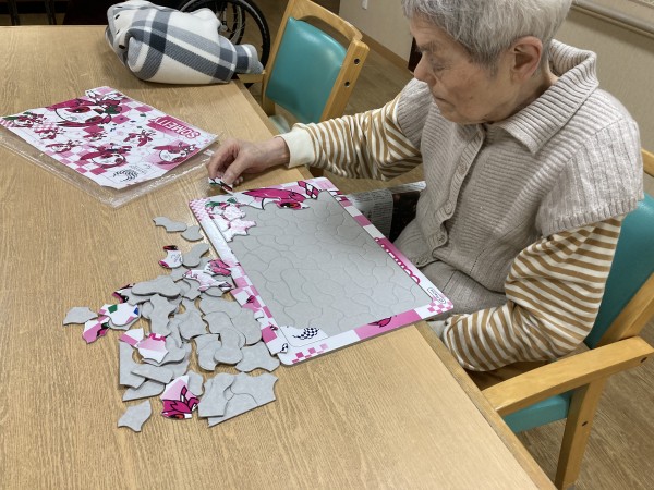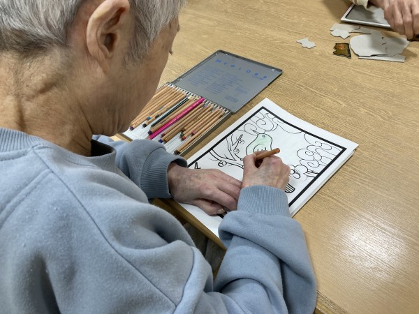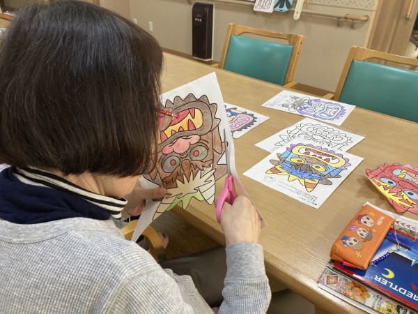 各フロアでは、2月の飾り作りや塗り絵、パズル等それぞれ楽しまれています。