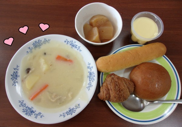おいしそうなパンと一緒に、ホーム長お手製のクリームシチュー(*^▽^*)‼