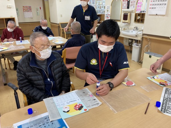 『わからないよ~』と言われながらご自分で頑張って貼られる方や、職員が糊を付けたものを貼る方、『目が見えないからやって!』と職員が春場所を確認しながら貼られる方。