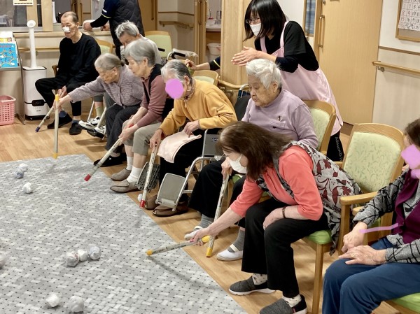 歌の後は2チームに分かれて相手の陣地に棒で雪を送るゲームを楽しみました❣️皆さん真剣な表情で一つでも相手の陣地に送ろうと必死です!対決ゲームは熱気があふれますね〜(^o^)楽しんでくださりありがとうございました❣️
