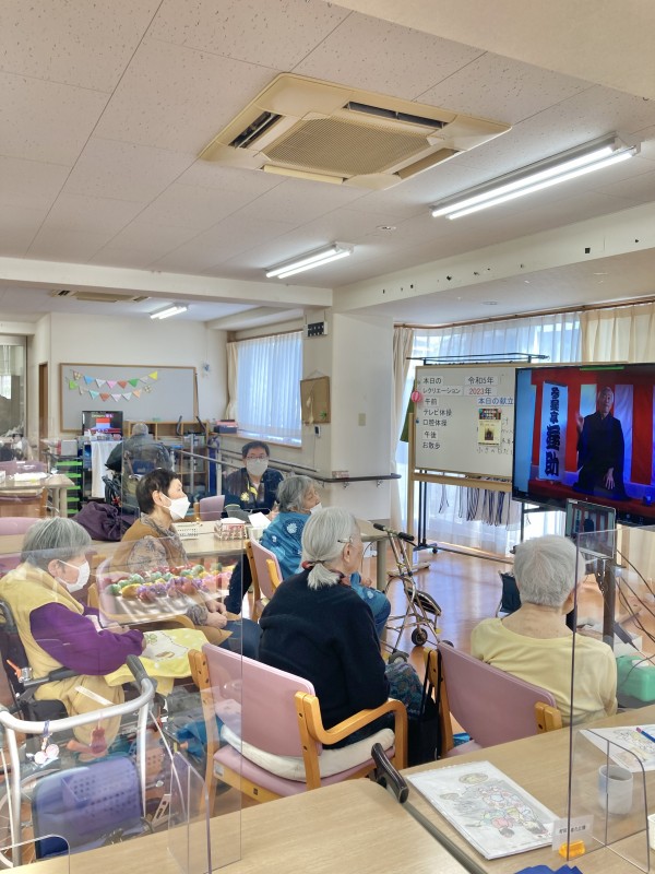 皆さん、テレビの落語に夢中でした。いつも違って、ゆっくりした時間が流れていました!