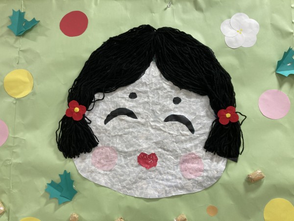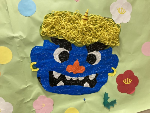 ブログの最初にも書きましたが、2月と言えば節分のイメージが強いので赤鬼と青鬼とおかめさんのちぎり絵で完成しました(*^-^*)