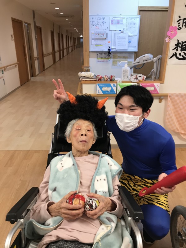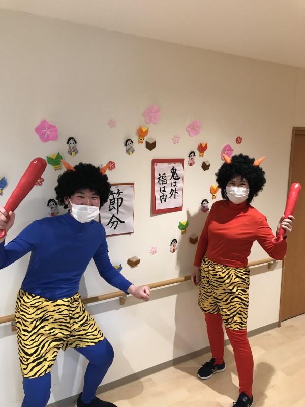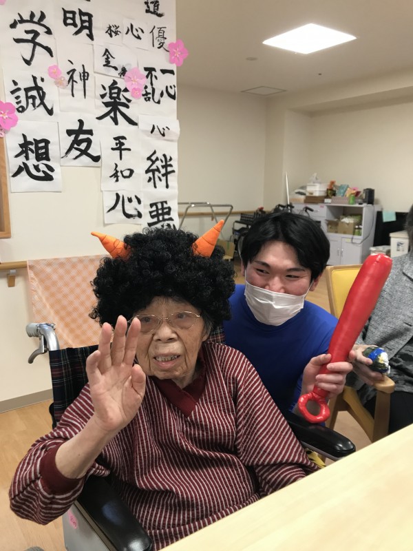 「鬼は〜外!福は〜内」と鬼に豆を投げていました。