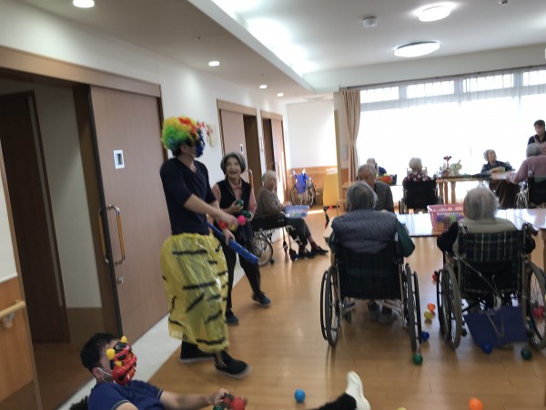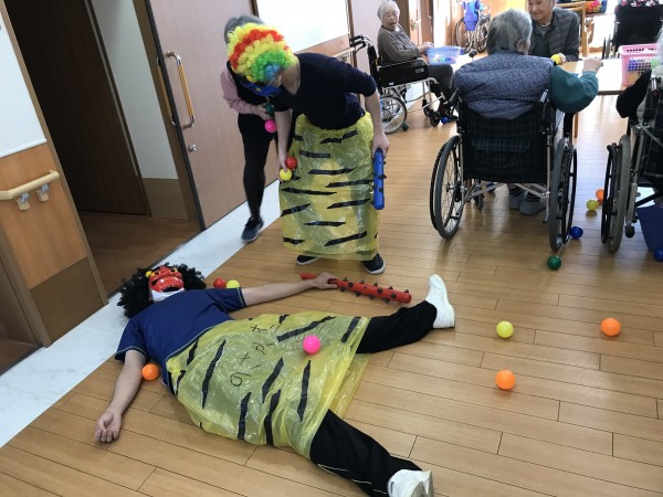 若い男性職員2名による鬼に扮して1F、2F、3Fの入居者様のもとへ2名の鬼が突撃です!!