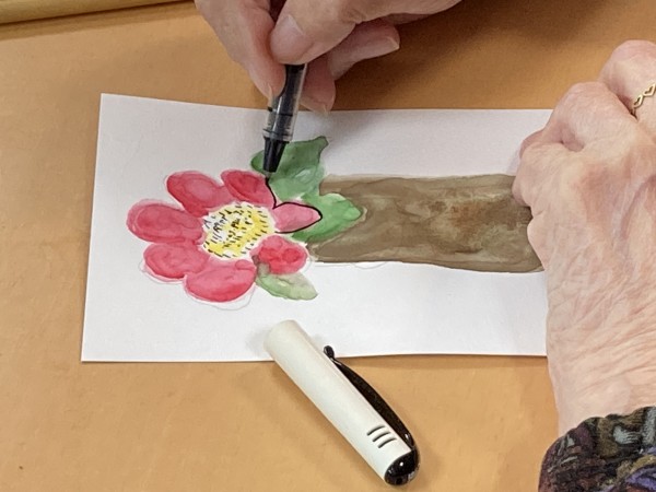 花の中心の細かな部分もよく観察しながら黒ペンで細かく描いていらっしゃいます