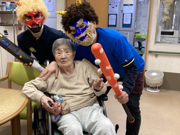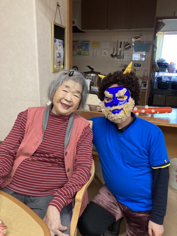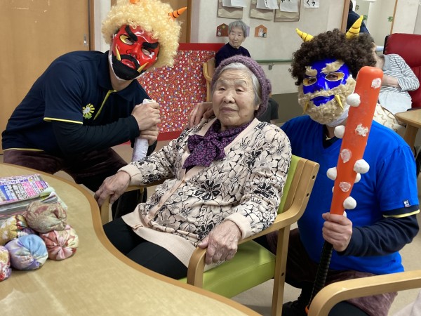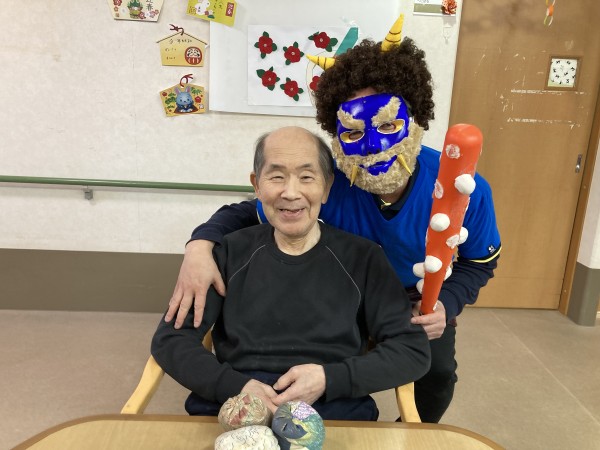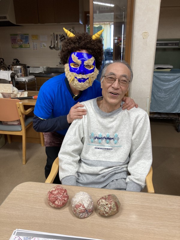 皆様鬼に扮した施設長、ケアスタッフに、目掛けてお手玉を投げて節分を行いました。