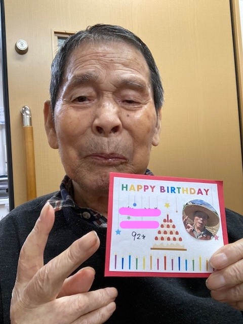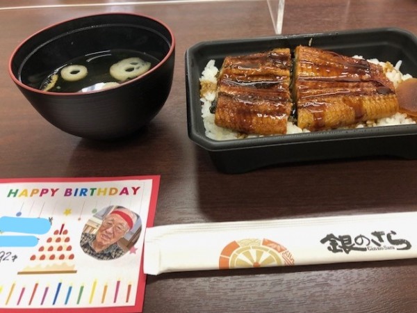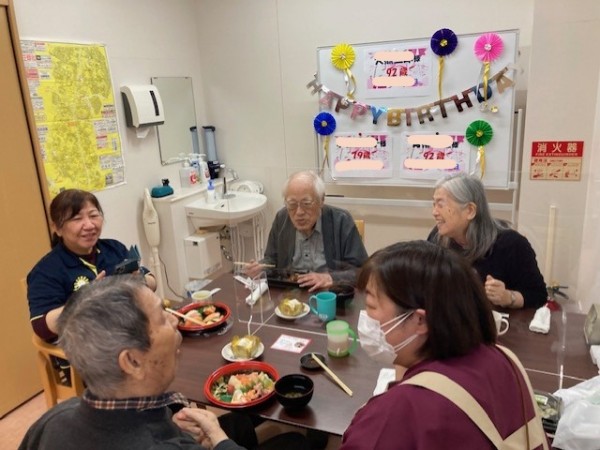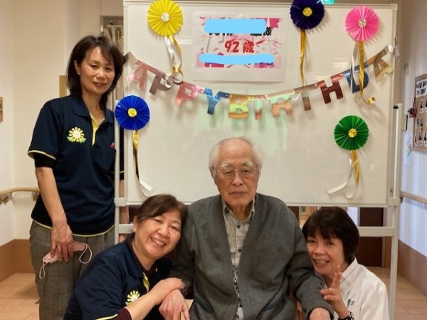 初めての事でうまく開催できるか心配でしたが、特定円阿弥の澤口ホーム長に進め方を教えて頂いたり、職員も誕生日カード、飾り、お名前カード、食事等の準備を協力してくれて特別な誕生日会開催に向けて一丸となりました。