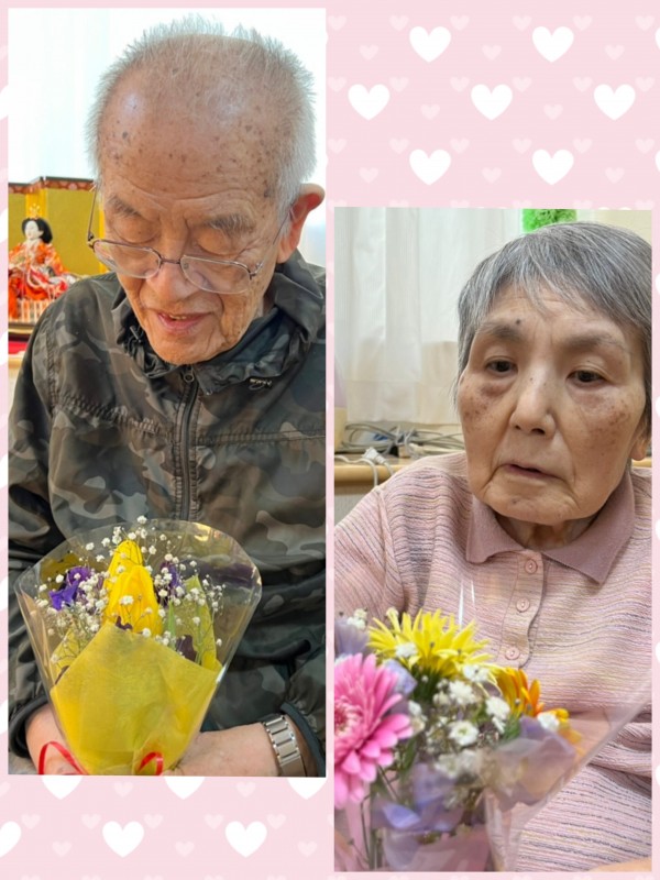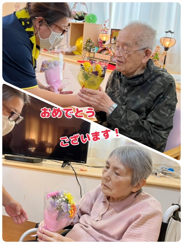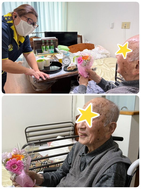 プレゼンターの宮沢ケアスタッフが、ブーケとケーキを持って、お部屋に駆けつけます!