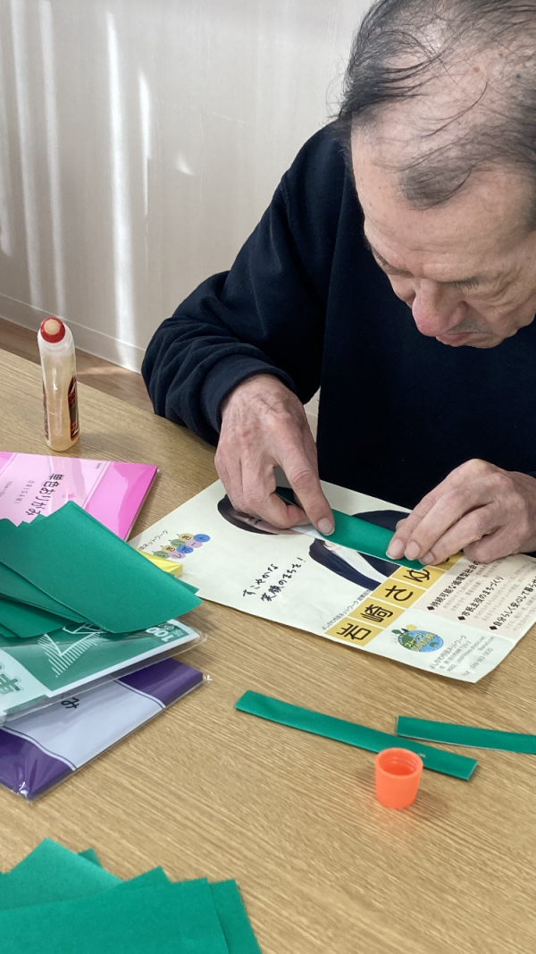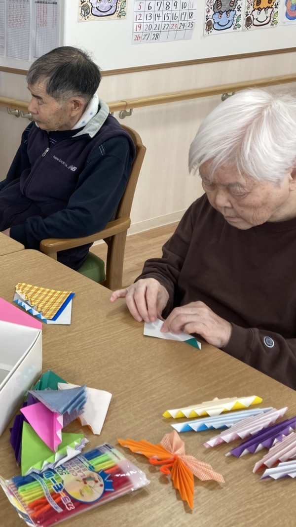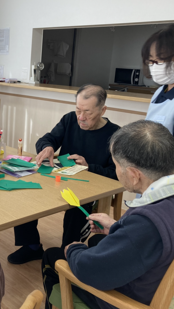 チューリップの花や茎を折ったり、折り紙を斜めにジグザグ、ジグザグ。モールも使って蝶々を作ります。