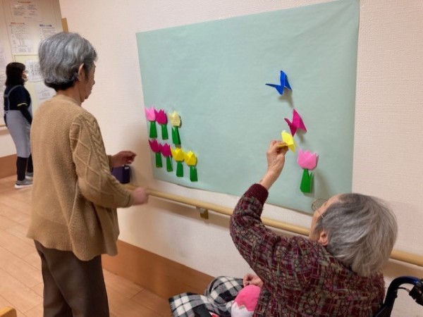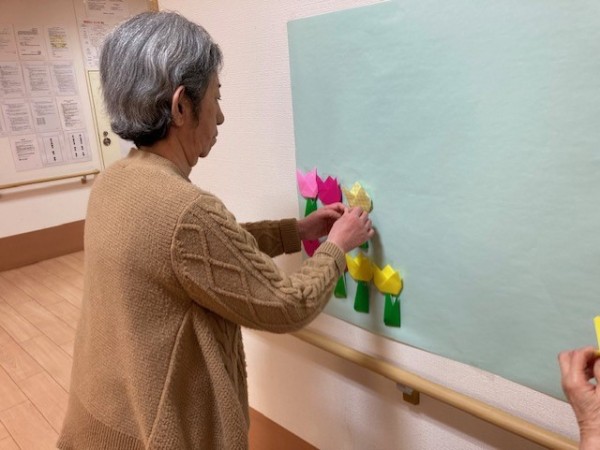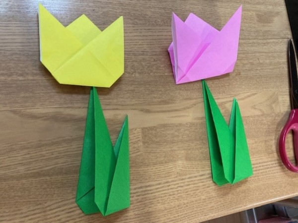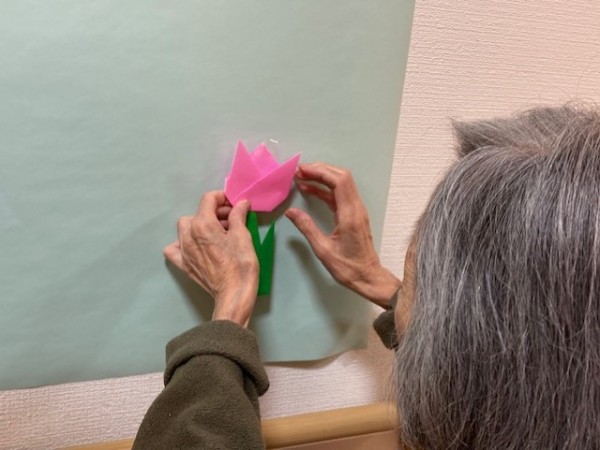 午後ホールに行ってみると、折り紙でチューリップを作っているのを発見( ゚Д゚)