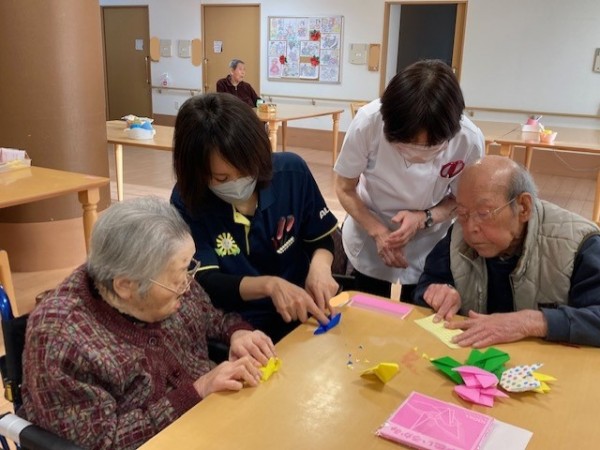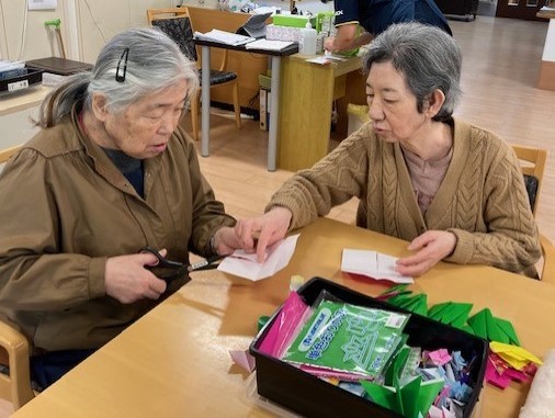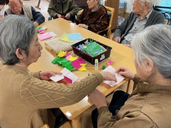 ホールで折り紙を始めたら自然とみんなが集まってきました