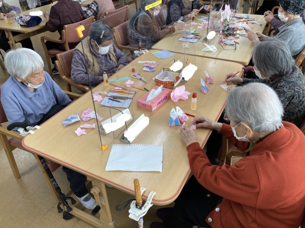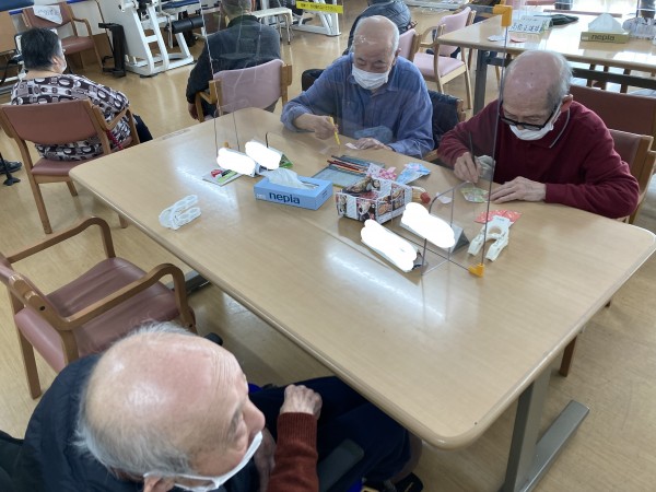 おひな様飾りの工作で、紙を切ったり、塗ったり、くっつけたりしました。