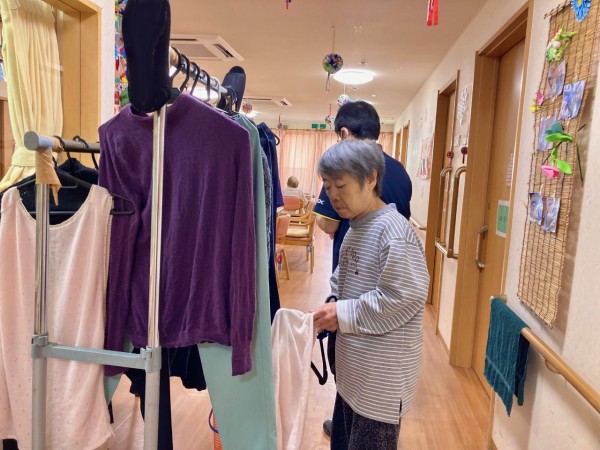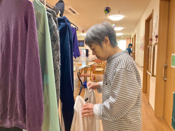 洗濯物を干しているケアスタッフを、近くでご覧になっていたご利用者様。