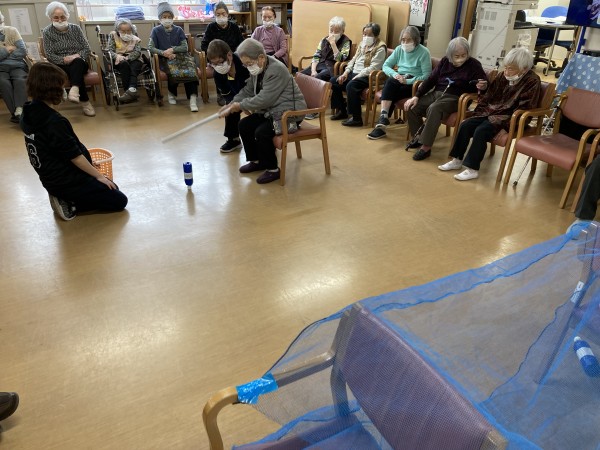 ペットボトルで作ったボトルを、棒でホッケーのように叩いてゴールに入れるゲームです。