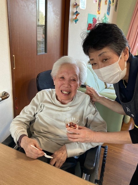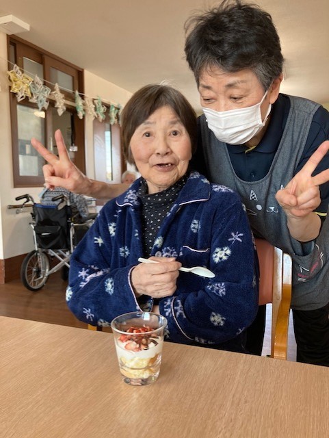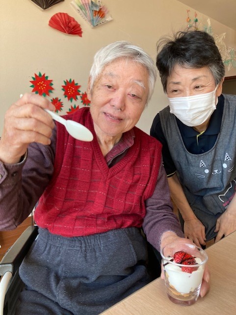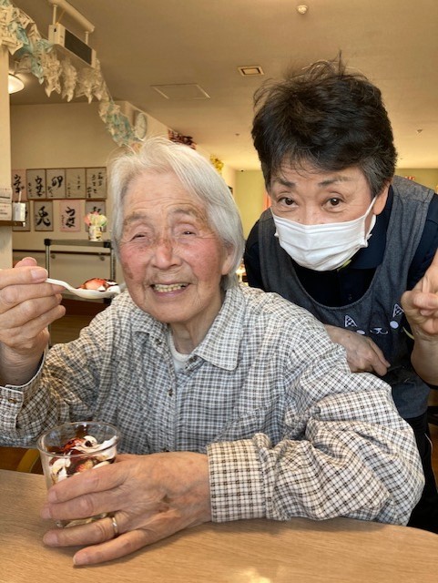 今回はお誕生日の方がいらっしゃらないので「生苺パフェ」を喜んでいるご利用者様の笑顔をご覧ください♪