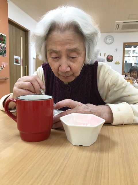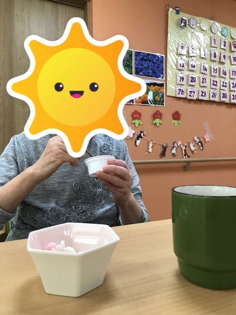 おやつに ひなあられ、ようかんにホイップクリームをのせて(*^^*)