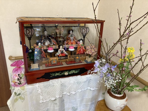 お雛様と利用者様で生けて下さった花を正面玄関に飾りました。