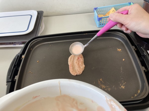 ホットプレートで生地を焼いてると