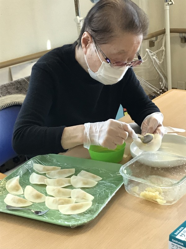 前日に作った中身を餃子の皮にはさんでいきます♪
