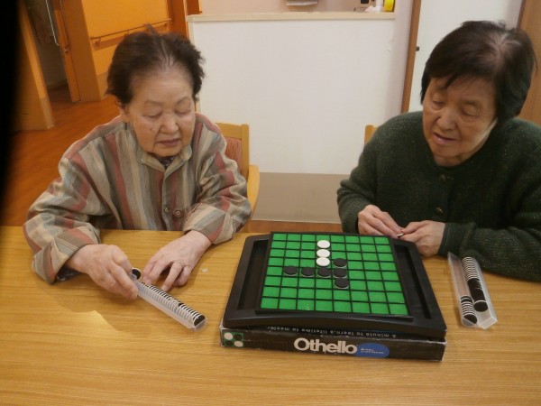 今日の午後はオセロゲームで対決だ!!わからない、ここはどう?と打っていきます。