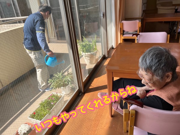 ご入居者様が見て楽しむ花に水やり。